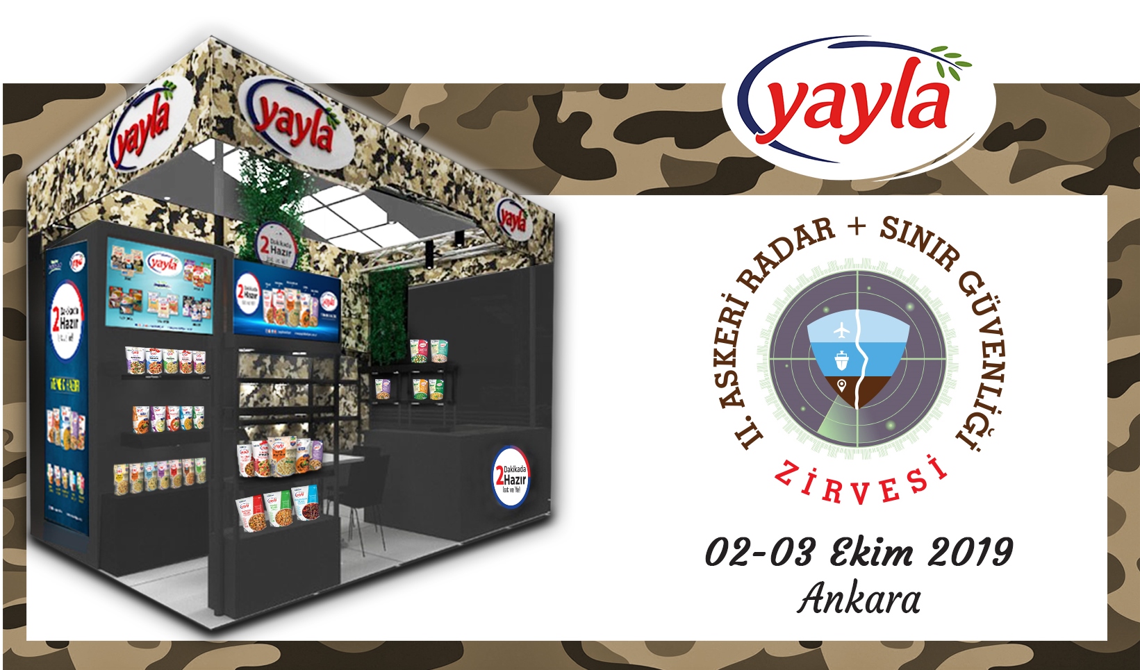 Yayla Bakliyat, 2-3 ekim tarihleri arasında Ankara’da düzenlenen 2. Askeri ve Radar ve Sınır Güvenliği Zirvesine katılıyor. Türk ordumuzun ihtiyaçlarına uygun olarak üretilen sağlıklı ve pratik hazır yemek ürünlerimizle Türk askerinin her zaman yanında olmaktan gurur duyuyoruz.