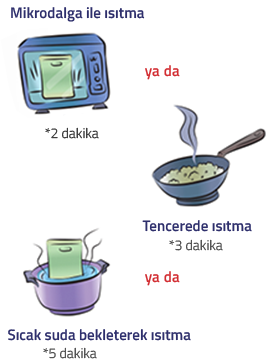 • Ürünümüzün ambalajını açmadan kaynar sıcak su içinde bekleterek 5 dakikada ısıtabilirsiniz.